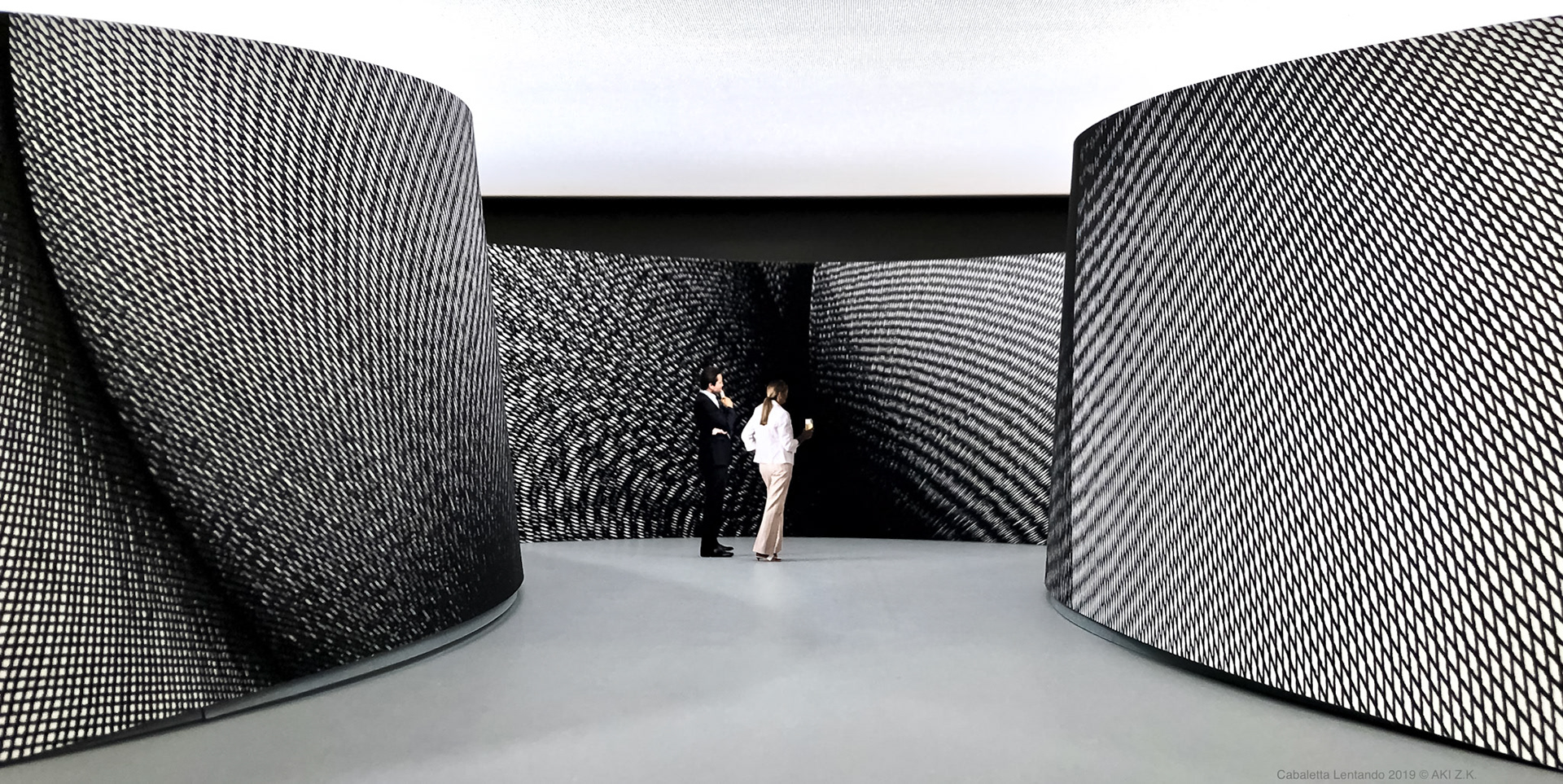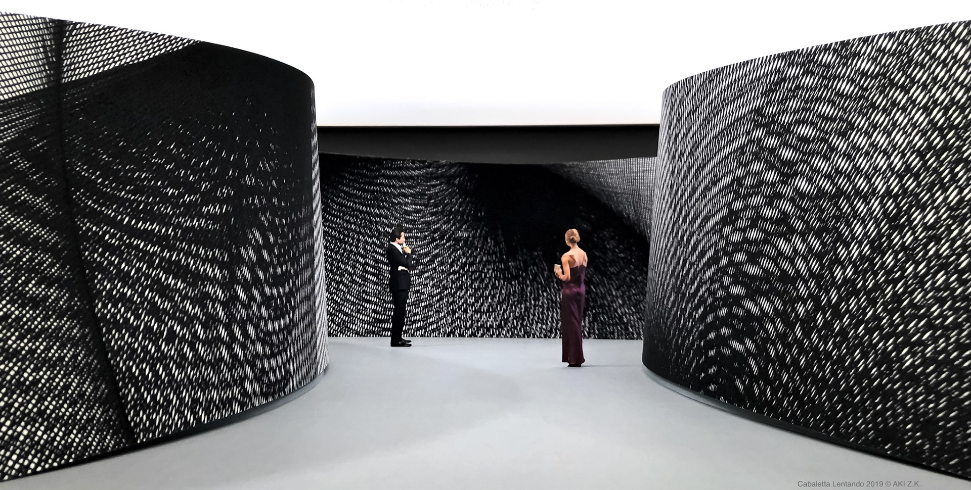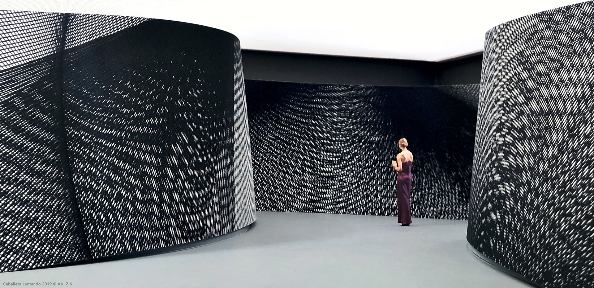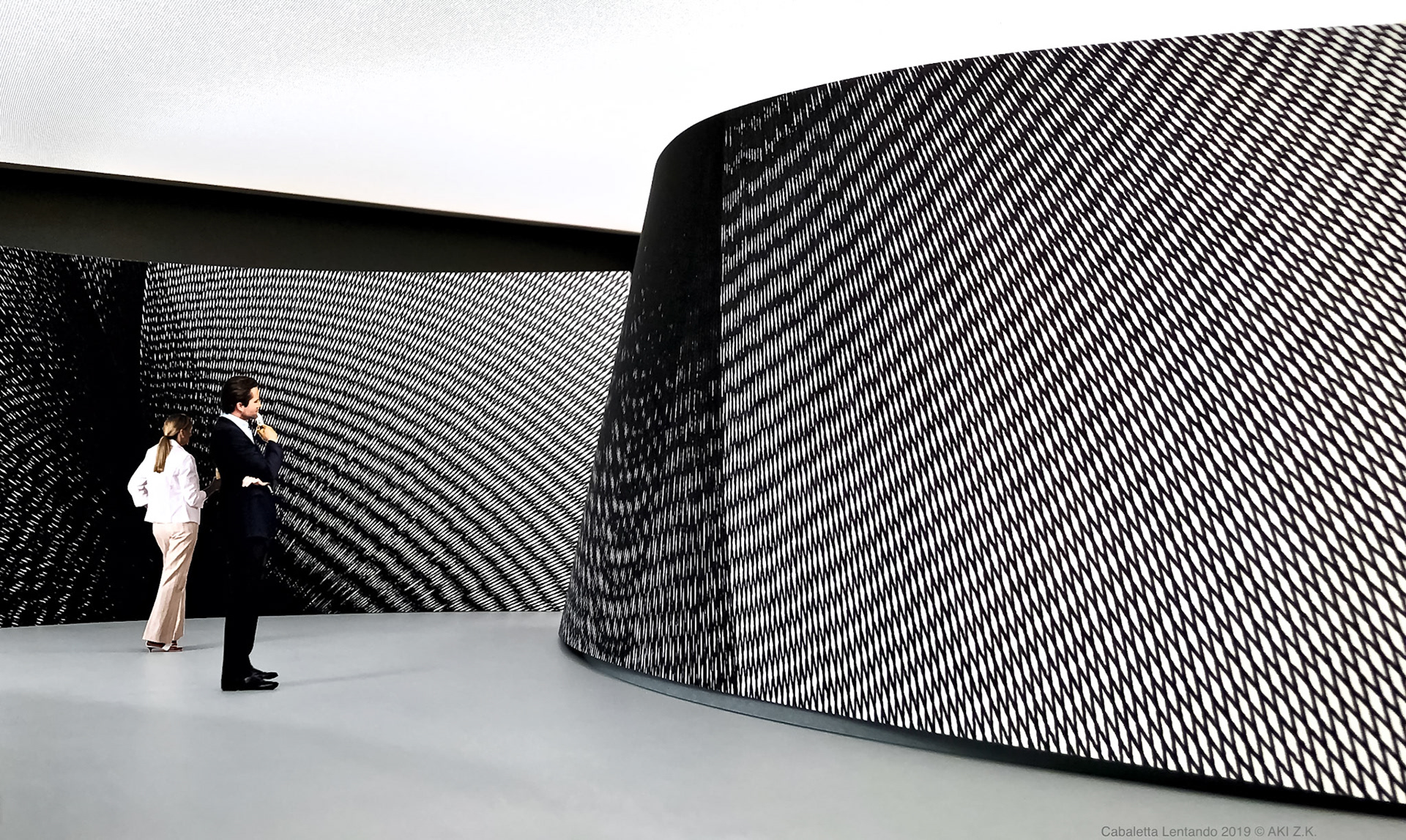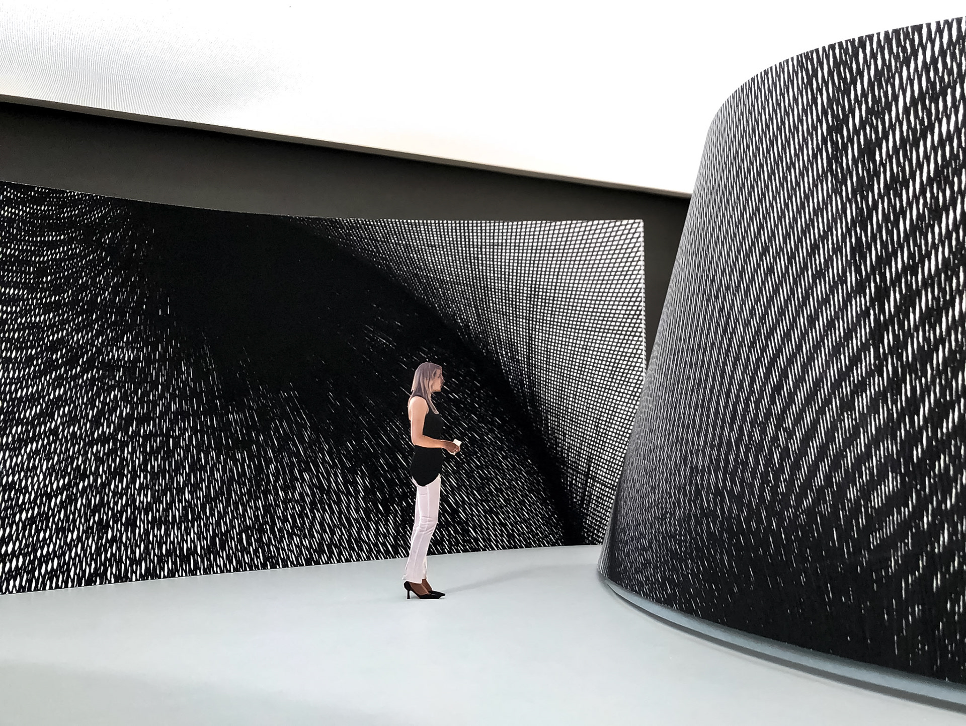 Architectural-scale art is created using a line drawing algorithm employing affine transformations of mathematical functions. The drawings are then enlarged, printed on a billboard-size canvas, and mounted on a wall surface. The room is enclosed by two convex and two concave walls, which are visually different yet have the same underlying equation.