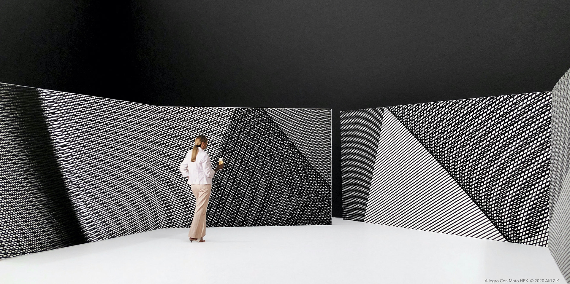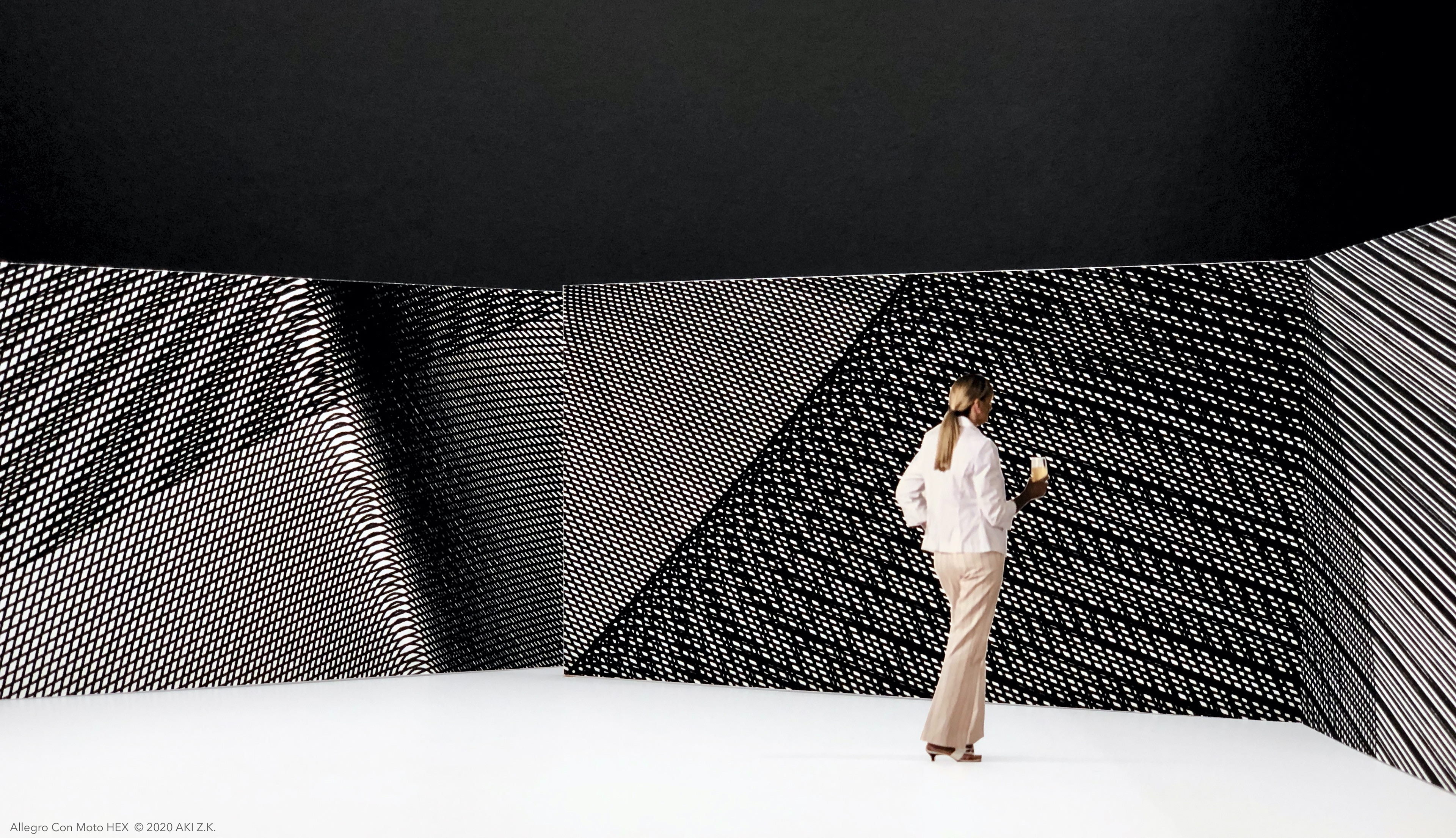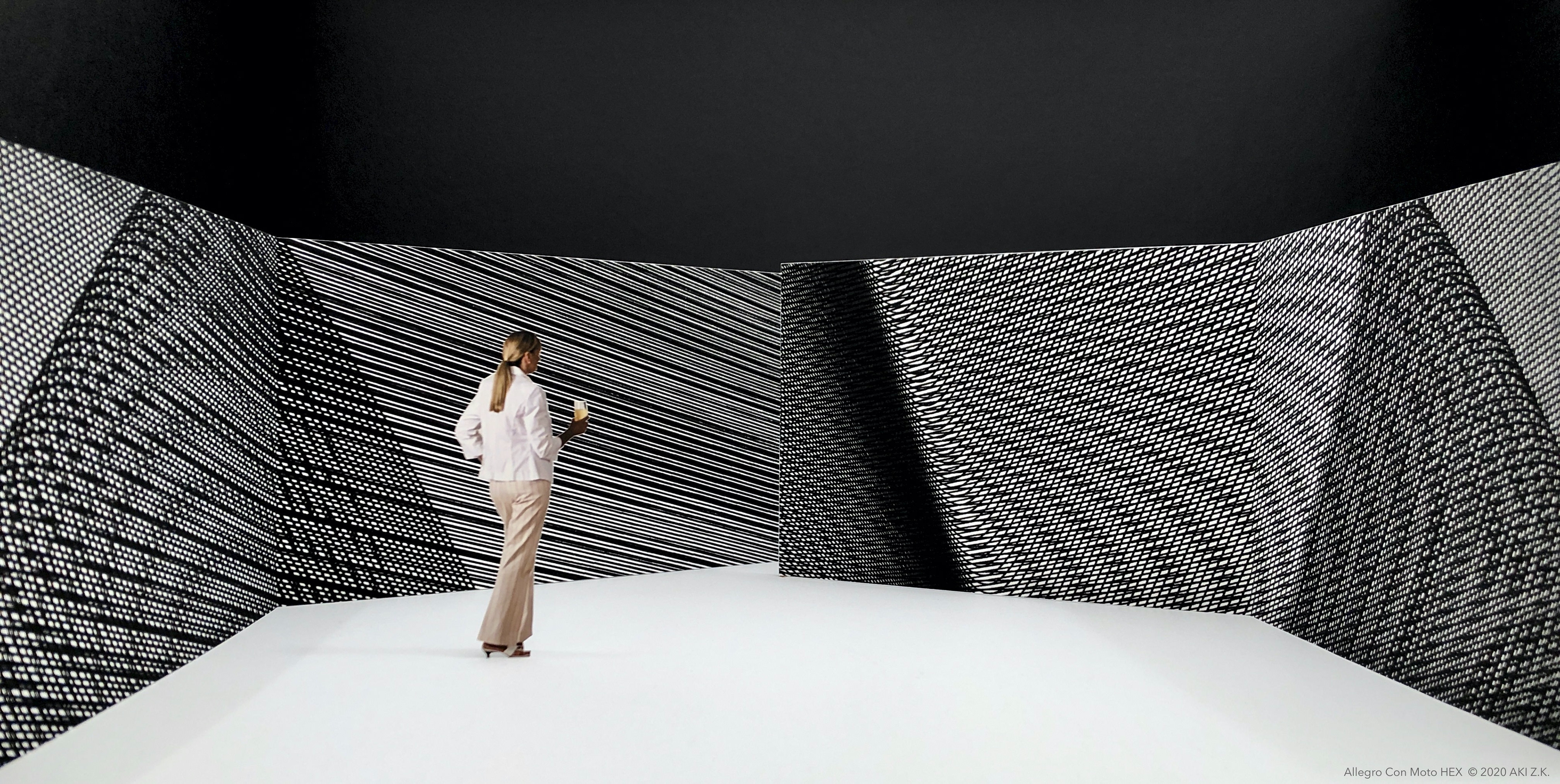 Architectural-scale art is created using a line drawing algorithm employing affine transformations of mathematical functions. The drawings are then enlarged, printed on a billboard-size canvas, and mounted on a wall surface. This walk-through environment is enclosed by three straight and bent walls, which are visually different yet share the same underlying equation.
