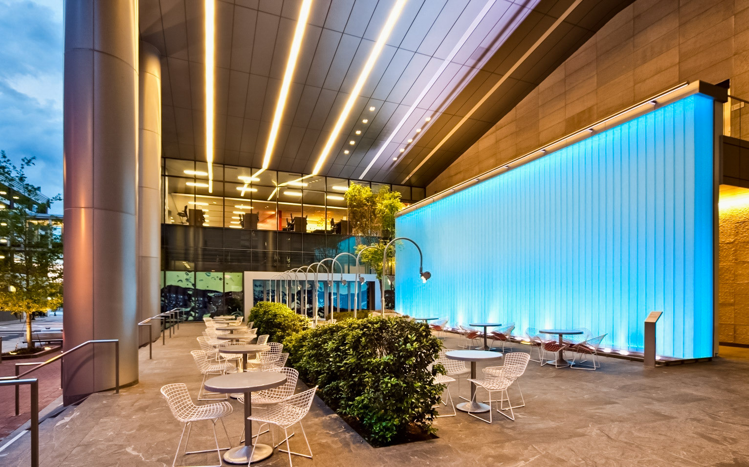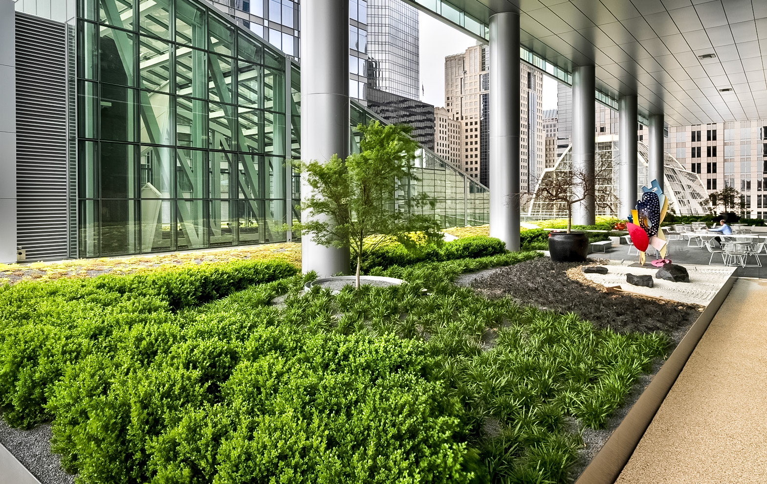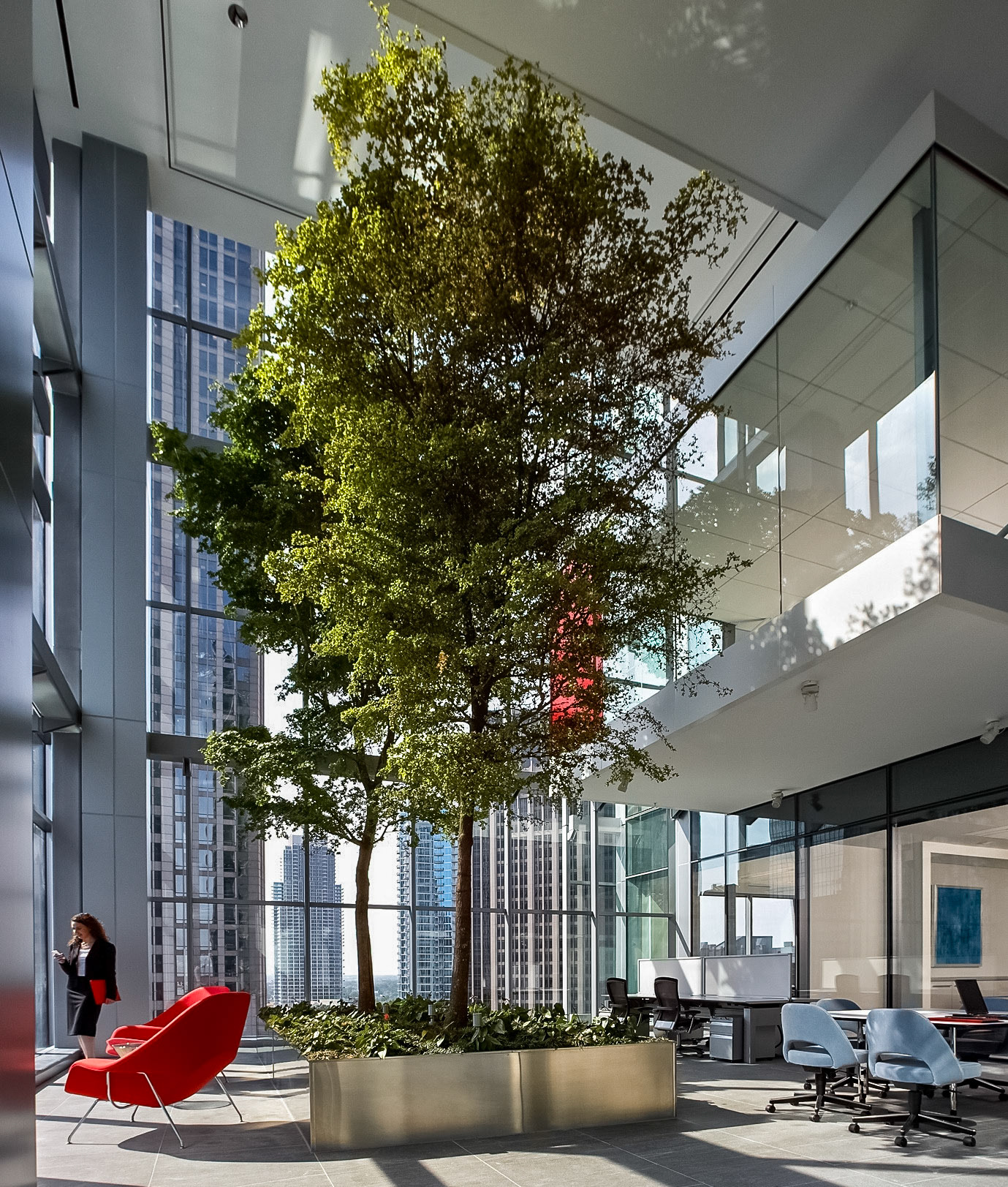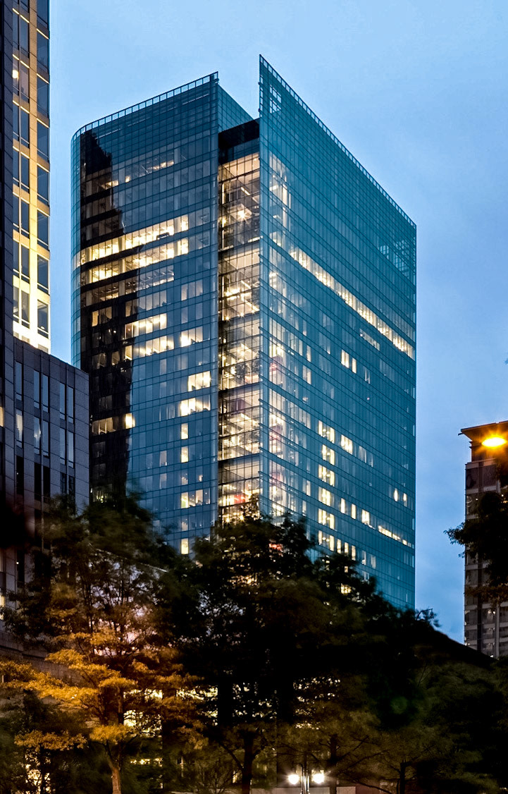 The 750,000 SF building is a 30-story office tower with an urban garden and an atrium that connects the new building to the existing headquarters and parking structure. The tower's design incorporates advanced sustainable features and cutting-edge interior landscapes with water features. A unique amenity is the 3-story sky gardens, which run continuously and vertically along the northeast and southwest corners of the office tower. The sky gardens encourage impromptu gatherings, team meetings, and relaxation areas. Designed at Perkins & Will, Aki Z. Knezevic AIA, Managing Principal, Ralph Johnson FAIA, Design Principal, Photos by James Steinkamp and A K I + Partners PLLC