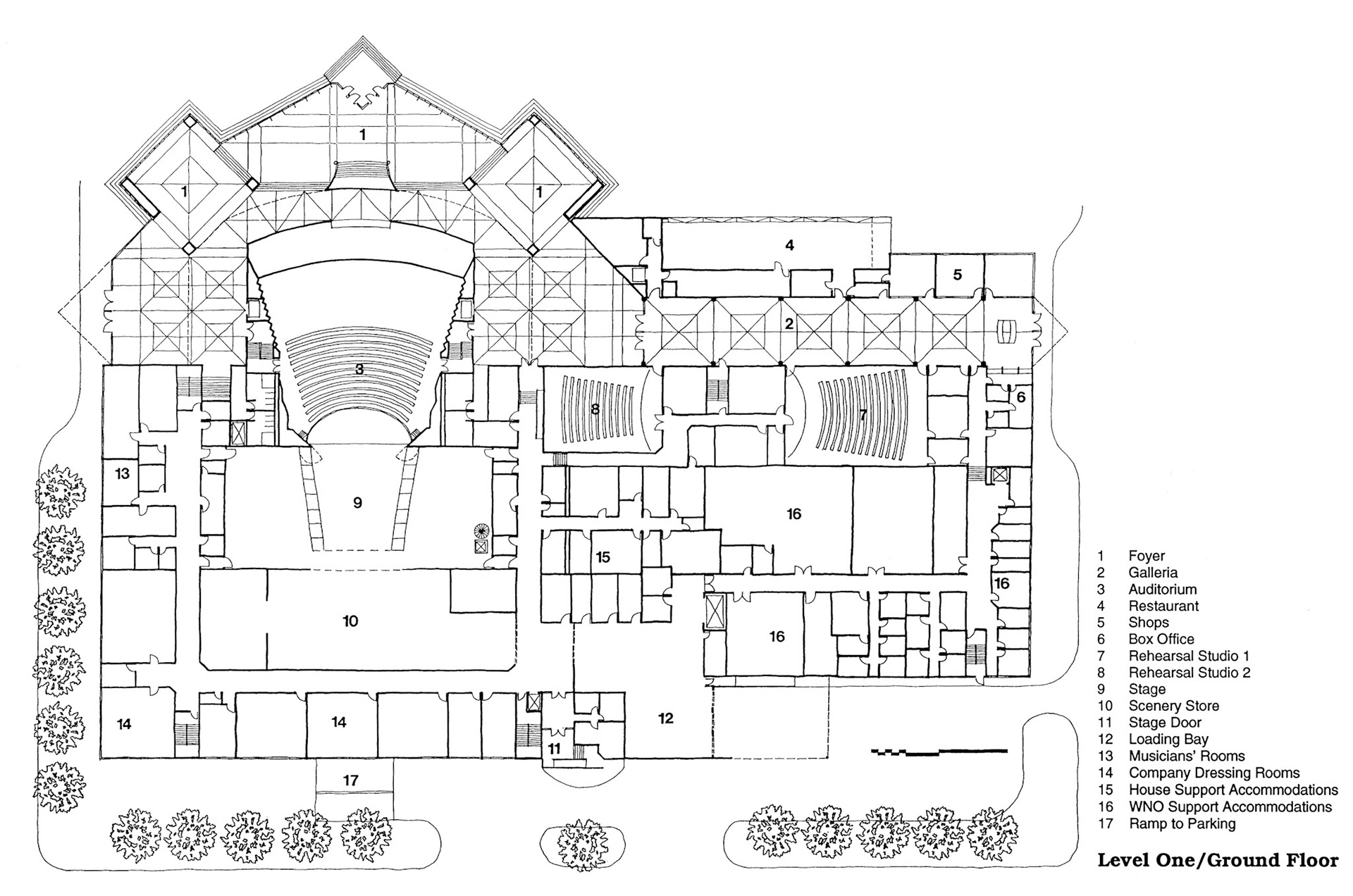 The program for the opera house competition presented two essential requirements: a very complex functional program typical of such an institution and a demanding urban context requiring a statement in the grand opera tradition. The proposed design reflects this dichotomy through an honest expression of architectural forms. The back-of-the-house's industrial simplicity contrasts with the main theater's monumental structure. Its foyers follow the bowed surface of the main auditorium and are framed with carillon towers. The expression is simultaneously futuristic and historical. On the urban scale, through music performances by the carillon bells, the impact of the opera house is extended toward the plaza and the city center. The long skylit Galleria has a more intimate scale and provides indoor space for shops and restaurants as well as a foyer for the smaller theatre venues. Designed at Collins & Knezevic LTD, Aki Z Knezevic AIA, Design Principal, Mary M Collins AIA, Managing Principal