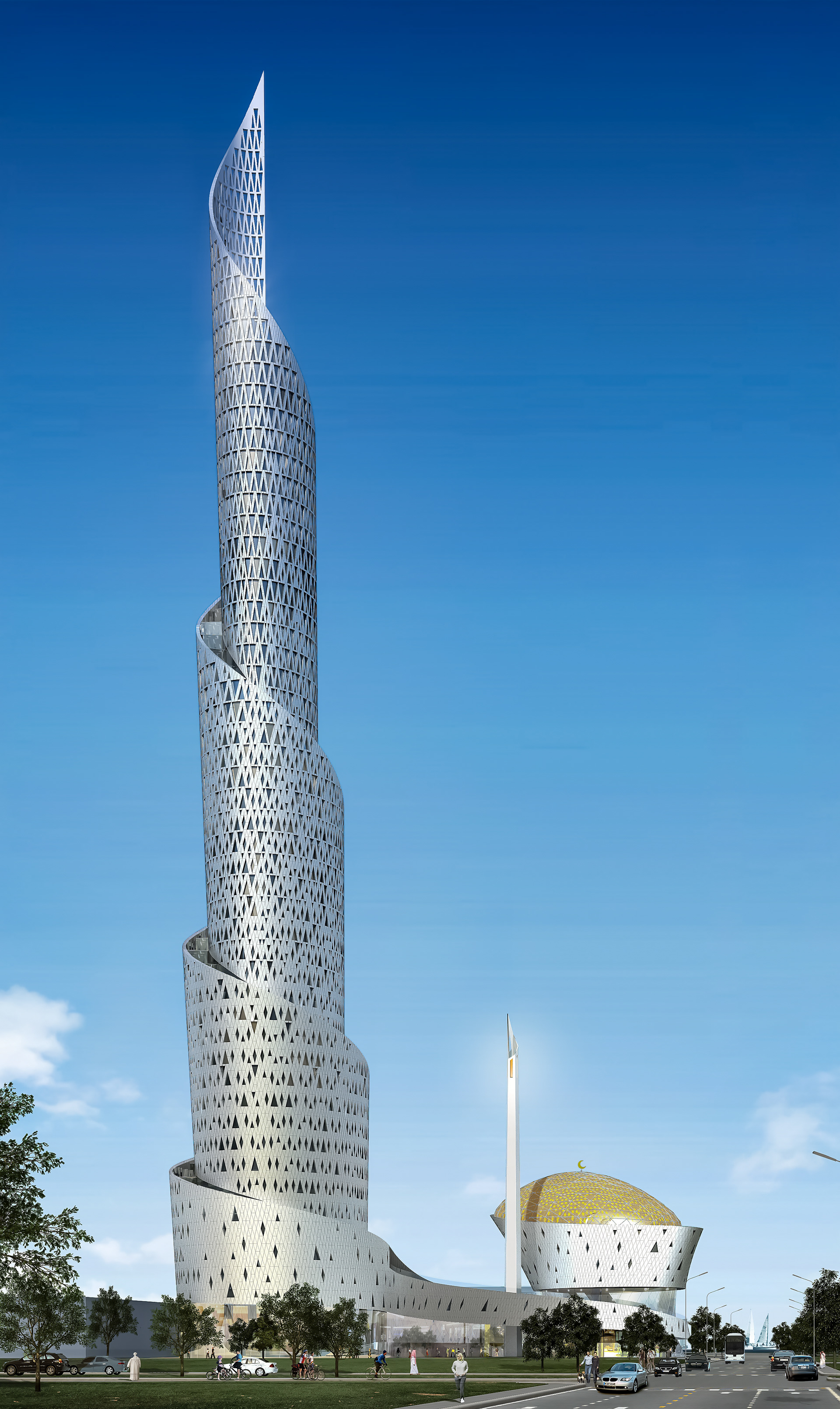 This 800,000-square-foot mixed-use development combines commercial, educational, technology, and research functions at the base with an adjacent iconic hotel and apartment tower. The design draws inspiration from an ancient spiral tower form and is a modern interpretation of that geometry. The Center will use the income from hotel and apartment operations to support local cultural and educational activities. Designed at Perkins & Will, Aki Z. Knezevic AIA, Principal-In-Charge, Structural concept by David Weihing PE SE, Senior Principal at Thornton Tomasetti