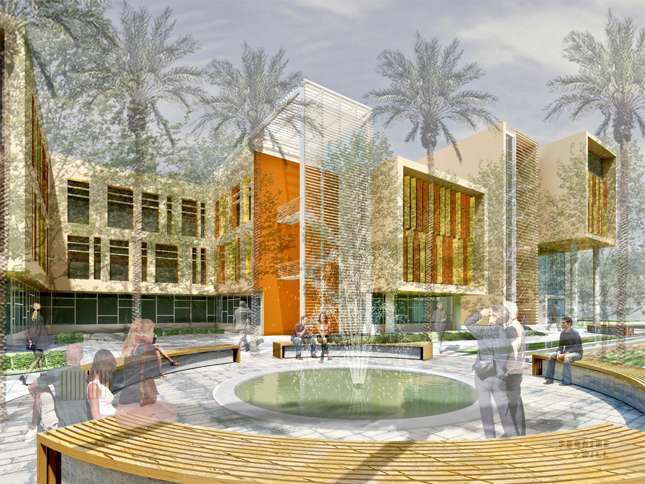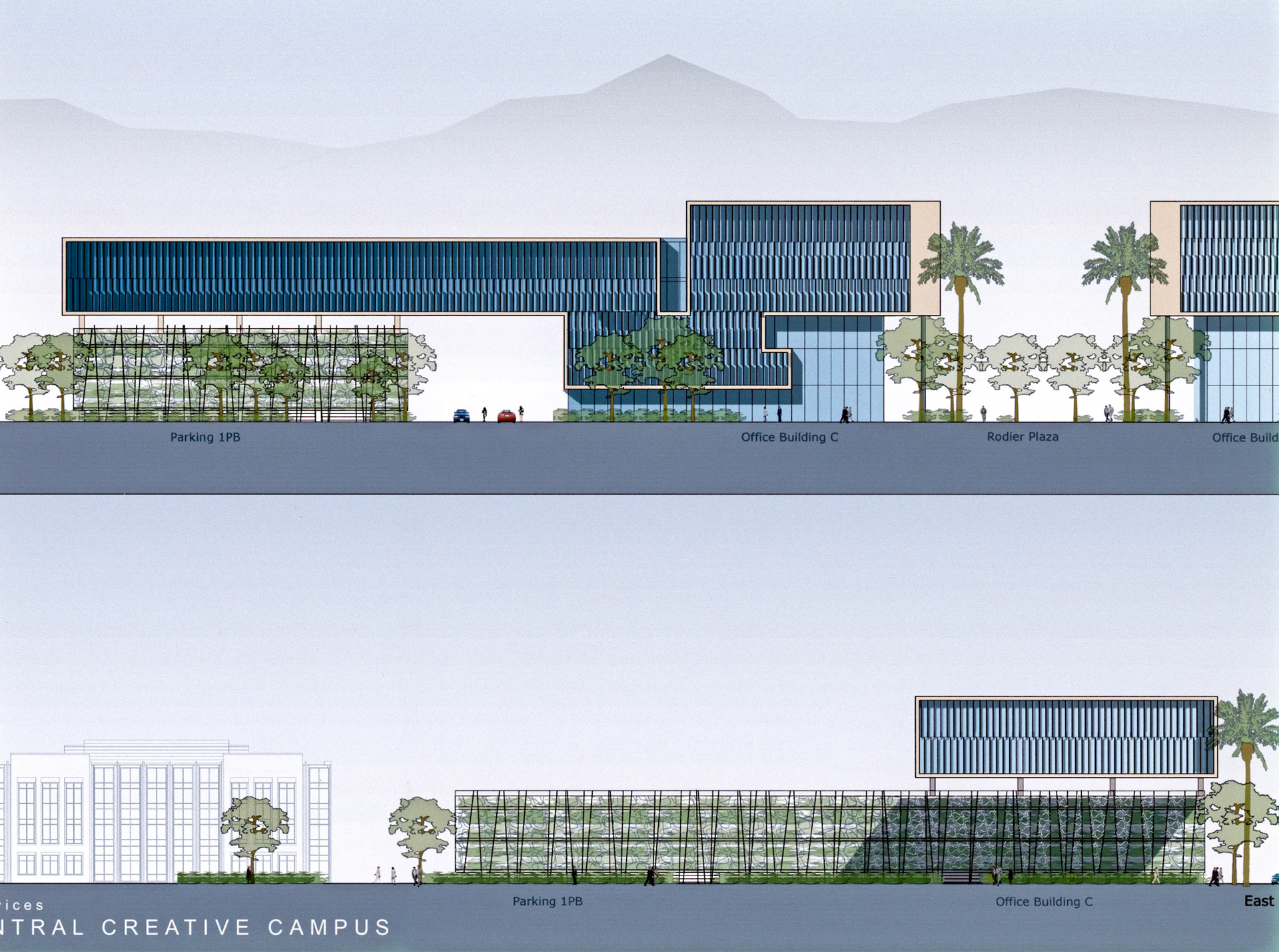 The proposed mixed-use project consists of three office buildings totaling 500,000 square feet, two parking garages for 2,100 vehicles, and a 20,000-square-foot amenity building for recreation and retail. The master plans for office space, courtyards, and pedestrian walkways accommodate Disney creative professionals' current and future needs. The exploration of architectural schemes balanced the brand's history with a contemporary sensibility. Designed at Perkins & Will, Aki Z Knezevic AIA, Managing Principal, Ralph Johnson FAIA, Design Principal, Renderings by Perkins & Will