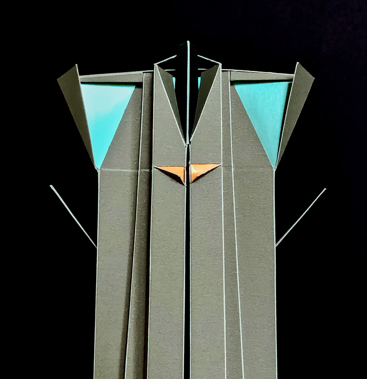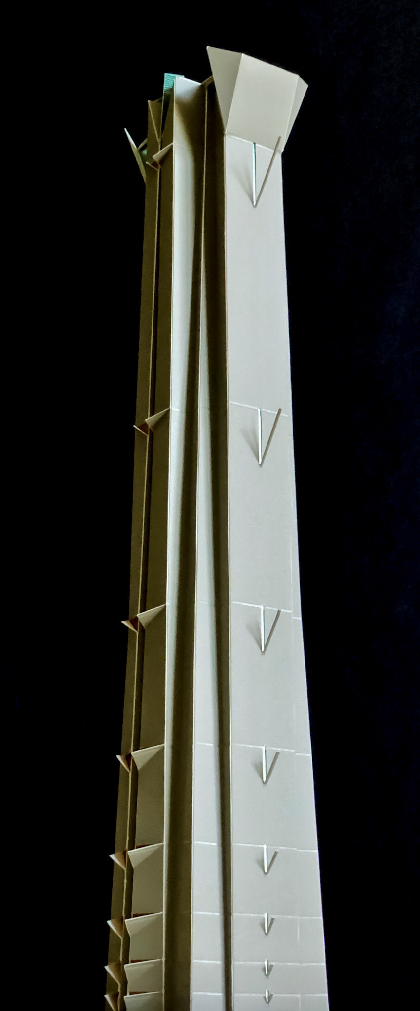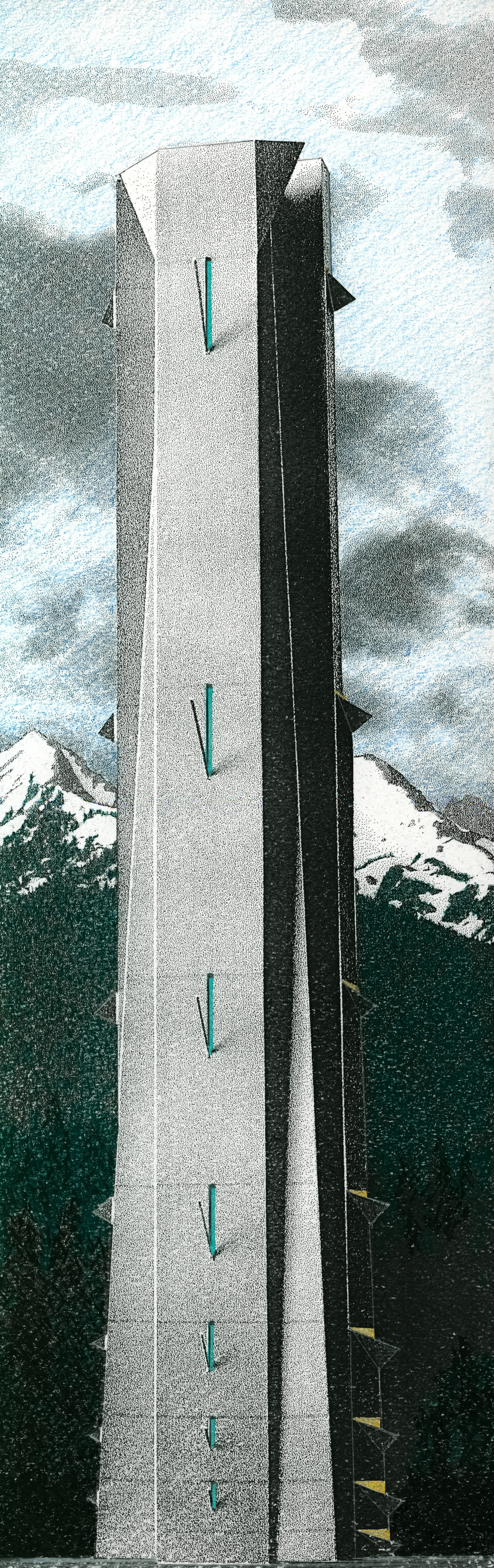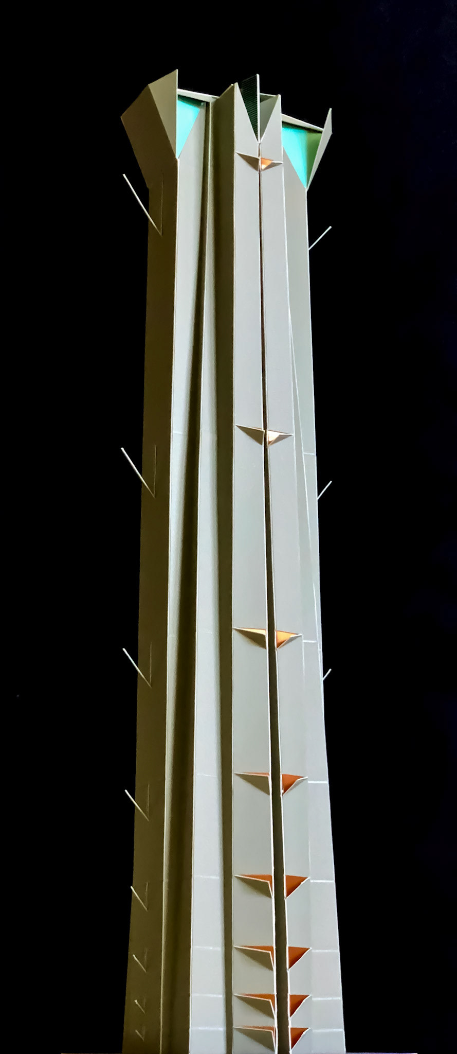 This conceptual proposal for a skyscraper mausoleum provides a more efficient land-conserving alternative to traditional cemeteries. It contains not only crypts and urns but also archival storage of information. A digital vault, networked to redundant servers, includes images, biographies, letters, videos, and other details on the entombed. This anthropological record is available to relatives, descendants, and historians for visits or study. The tower is a 1,000-foot-tall stone-clad structure topped with a non-denominational chapel. The shell of the building is constructed first, and the hollow space below the chapel is filled with crypts and urns over time. The exterior topology of the form uses non-linear numeric progression and subtle angles to express stability and time progression. The overall shape subtly references a mythical obelisk, simultaneously traditional and futuristic. Triangular atria punctuate the walls for peaceful meditation and viewing the interred's archived history. The chapel integrates art with architecture to create a complex, dynamic space for deeper spiritual engagement. Sponsor: Gwenda Jay Gallery