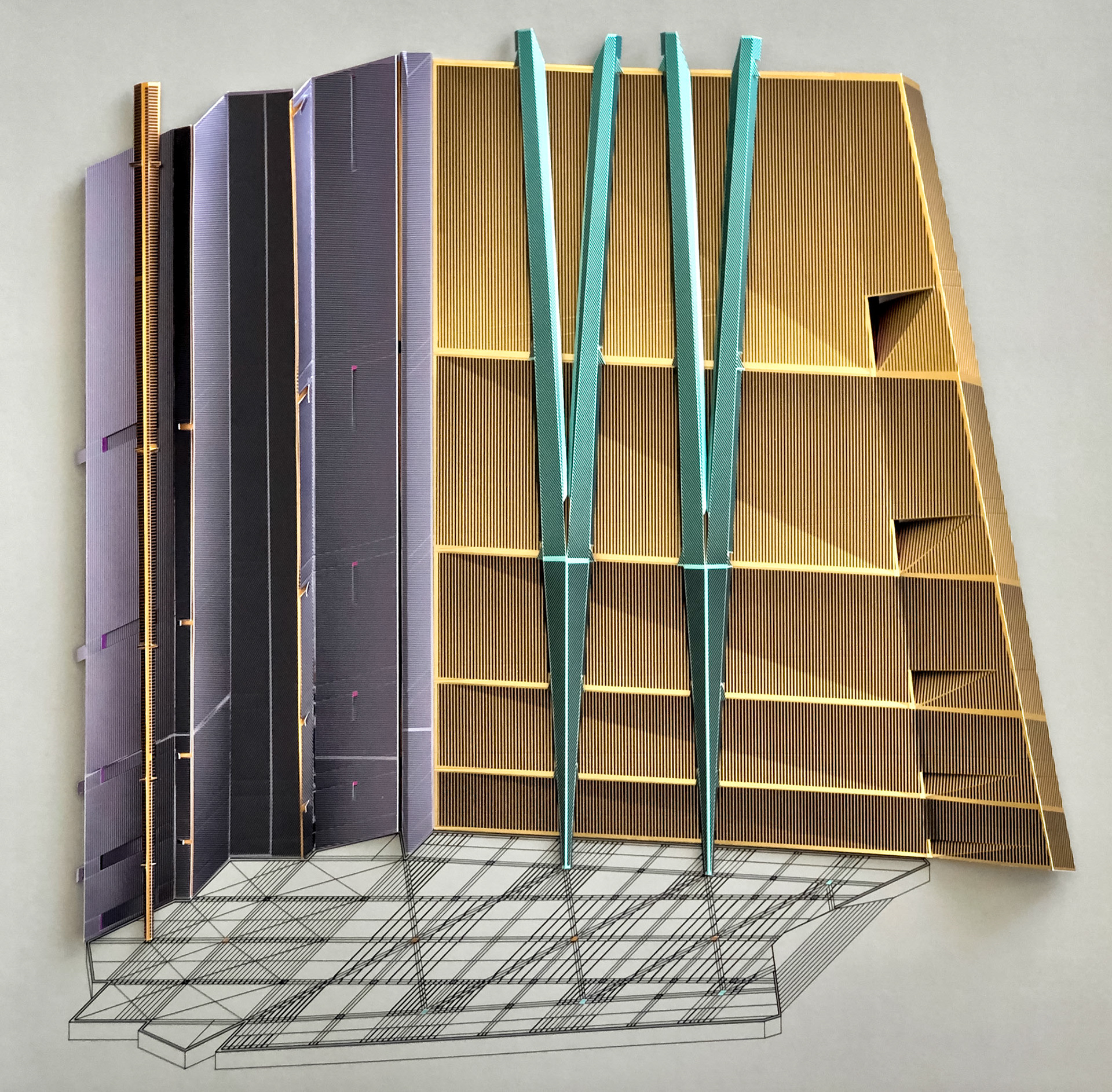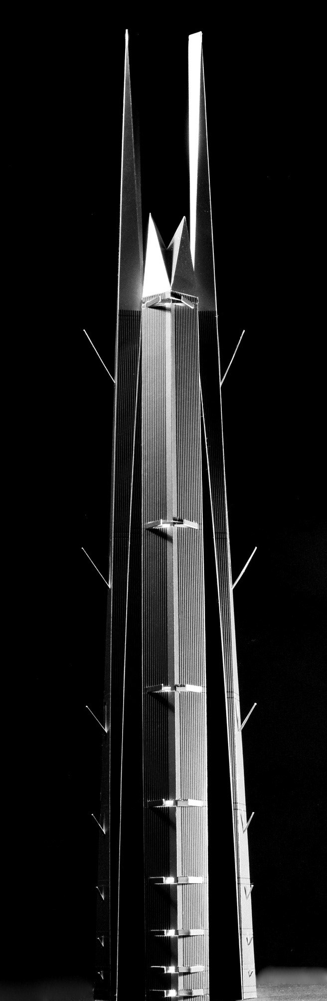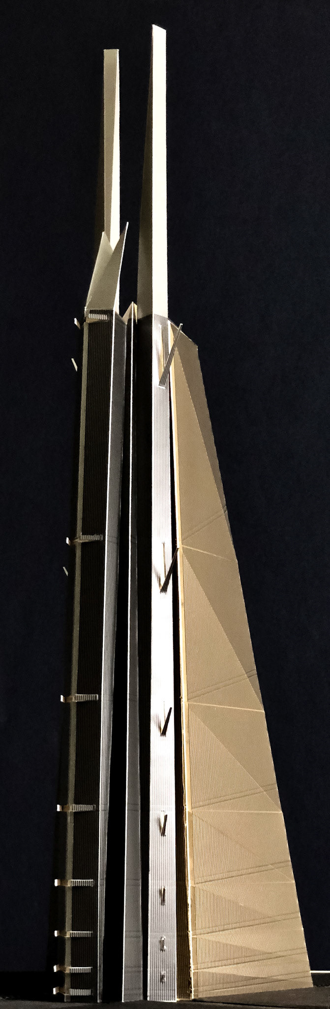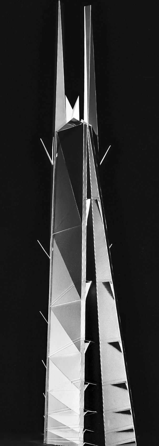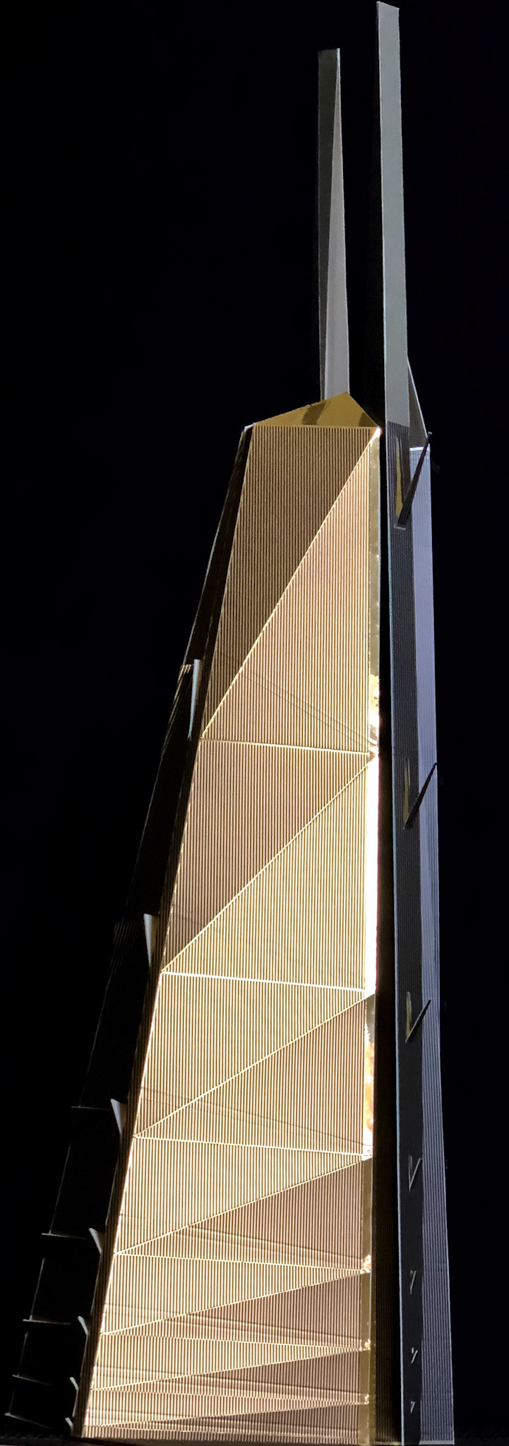 The proposal envisions a single super tall sanctuary space, solid in the front and glass in the main body of the cathedral. Geometric progressions on the facade interlace the solid, and the transparent and long spikes separate from the surface at various points to capture or reflect light. The structure reinforces this duality with concrete used in the solid section and steel used in the glass section, each supporting the other. A unique impression of this immense space is formed by sound dissipating vertically into the two bell towers with moderate reverberation. Sponsor: Gwenda Jay Gallery, Chicago